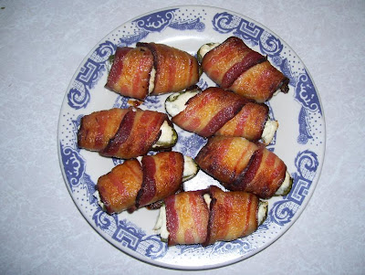 Next fill each half even full of softened cream cheese. And then wrap a piece of bacon around it and place on a baking sheet, a jelly roll or cake pan work best. Bake at 350 until bacon has reached your desired crispness.