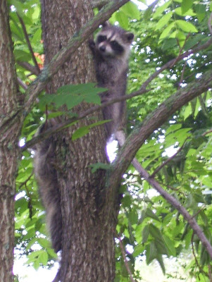 I was surprised recently when I stepped outside our back door and saw three baby raccoons. They hurried up a nearby tree but the one had to pause long enough to curiously watch me take his picture.