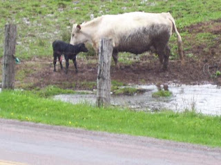 I couldn't see a thing though and as I was turning to go back into the house our neighbor called from his yard and asked if I had seen the calf being swept away. He was concerned about it as well but we decided that there really is nothing an 86 year old man and I can do about it except feel sorry. The water running across the road kept us far enough apart that we had to yell our entire conversation.